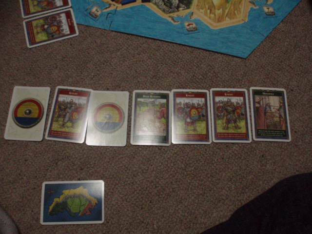 盗賊三枚で2ポイント、さらに2ロードで最長交易路を獲得。